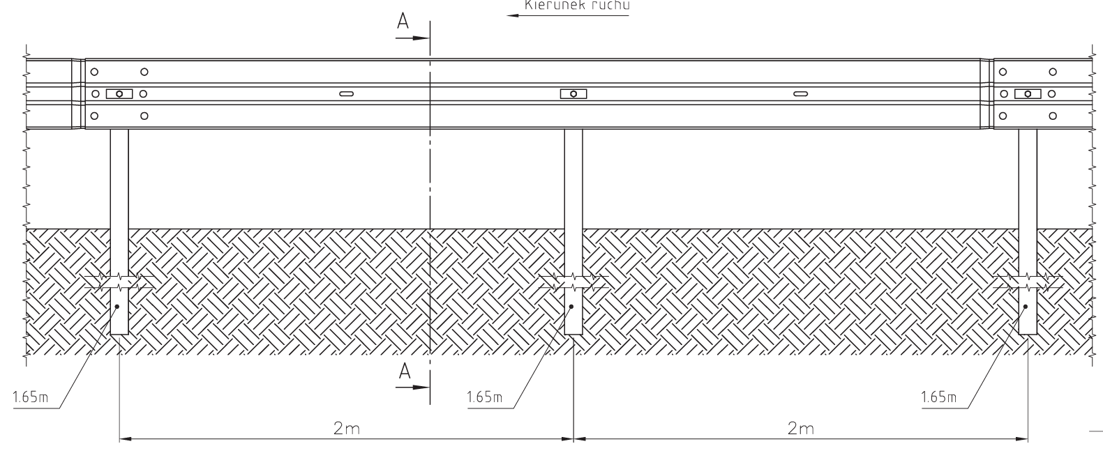 Bariera ma wysokość 0,75 m oraz szerokość całkowitą 0,22 m. Konstrukcja opiera się na słupkach stalowych rozmieszczonych co 2,0 m, o długości od 1,65 m do 2,30 m, co zapewnia stabilność i trwałość systemu. Produkt dostępny jest z profilami prowadzącymi typu A i B, co pozwala na dostosowanie do różnych typów dróg i warunków technicznych.