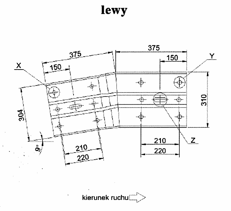 Łącznik 9° służy do połączenia poziomej prowadnicy bariery z jej skośnym zakończeniem, tworząc płynne zejście do gruntu na odcinku 4 metrów. Stosowany jest zgodnie z projektem, tam gdzie wymagane jest zakończenie ukośne bariery.